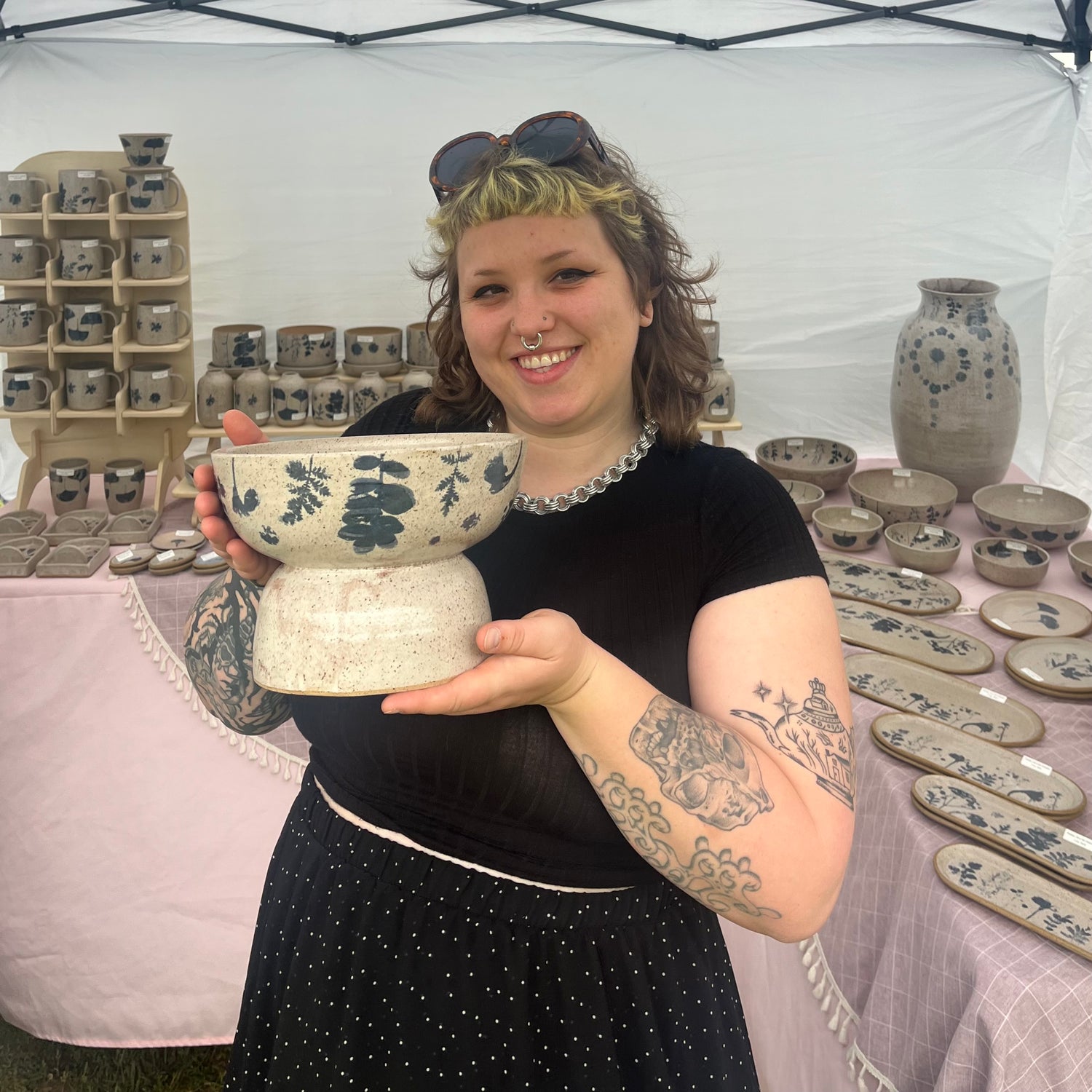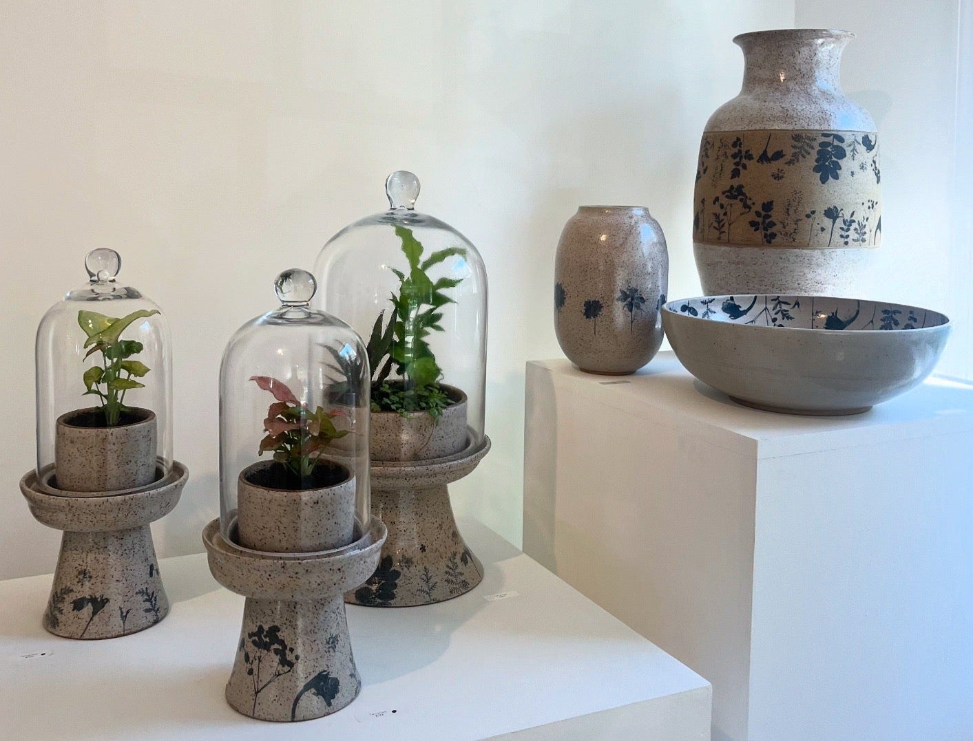 Throws Like a Girl Ceramics artfully merges ceramics and screen printing by decorating every piece with hand printed botanical transfers. Each plant is pressed and burned into a silkscreen, which is then printed on paper with underglaze and transferred to the pot. Her work marries the natural world and a historical hand-craft through unique and innovative technique.